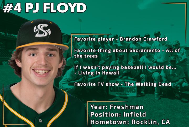 In our March 4th update we told you about PJ Floyd’s first collegiate hit, a pinch-hit triple that knocked in a pair of runs. Floyd was rewarded for his milestone hit with the first two starts of his college career this weekend. He batted leadoff and was the Designated Hitter for Sacramento State on Saturday and Sunday against the 17th-ranked UCSB Gauchos, going three-for-eight with an RBI and run scored. Although the freshman is normally a shortstop, Floyd has only played three innings of defense this year -- all at second base -- and has yet to face any fielding chances. He has a .364 batting average this season with three RBI in 11 at-bats.